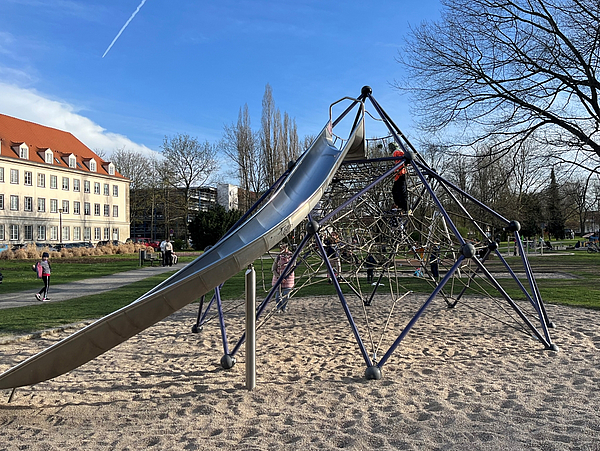 Der Spielplatz im Park des Jagdschlosses Graupa thematisiert den einstigen Jagdweg der sächsischen Kurfürsten im nahegelegenen Wald. Kleine Abenteurer können hier über Brücken, Bögen und Hindernisse klettern. Sieben Brückenelemente verbinden die Spielelemente miteinander.