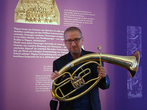 Dr. Mende erklärt am virtuellen Orchestergraben, was eine Wagnertuba ist und wann sie benutzt wird.