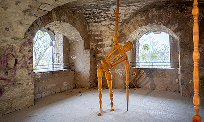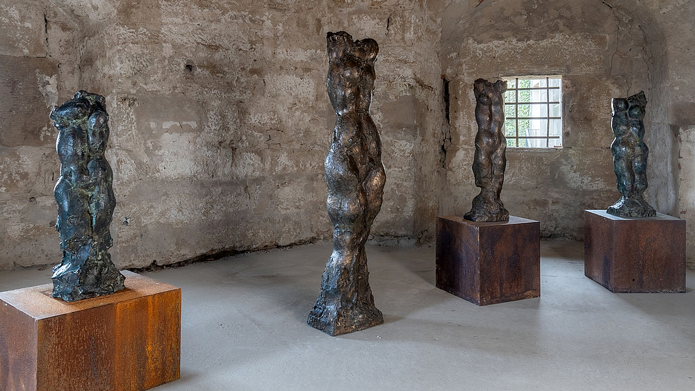 Die Ausstellung vereint internationale, tschechische und deutsche Kunstschaffende verschiedener Generationen, die in ihren Arbeiten die Spannungen und Möglichkeiten des Dazwischen thematisieren. Die Werke, die von Gips über Bronze und Stahl bis hin zu Installationen und interaktiven Elementen reichen, reflektieren die Vielfalt menschlicher Erfahrungen und die Komplexität zwischenmenschlicher Beziehungen. Diese Vielzahl an Materialien und Techniken spiegelt nicht nur die individuelle Handschrift der KünstlerInnen wider, sondern auch die unterschiedlichen kulturellen Hintergründe, die in einem grenzübergreifenden Kontext aufeinandertreffen. Die Festungsanlage in Pirna, mit ihrer beeindruckenden Architektur aus Kreuzgewölben, Betondecken und Balkonen zwischen den Türmen, bietet einen einzigartigen Rahmen für diese Thematik. Die architektonischen Elemente schaffen eine Atmosphäre, die das Gefühl des Dazwischen verstärkt. Die Räume der Festung laden dazu ein, sich mit den Übergängen und Schwellen zu beschäftigen, die sowohl physisch als auch metaphorisch erfahrbar sind. Hier treffen sich Vergangenheit und Gegenwart, Tradition und Innovation, und die BesucherInnen sind eingeladen, in diesen Zwischenräumen zu verweilen und ihre eigenen Interpretationen zu entwickeln. In der Auseinandersetzung mit dem Dazwischen kann das Publikum auch eigene Erfahrungen und Emotionen reflektieren. Der Zustand des Dazwischen ist nicht nur ein ästhetisches Konzept, sondern auch ein existenzielles Phänomen, das uns herausfordert, über die Grenzen des Bekannten hinauszudenken. Es ist ein Raum des Wandels, des Wachsens und des Suchens, der sowohl Verletzlichkeit als auch Stärke in sich birgt. Die Ausstellung „Dazwischen“ wird somit zu einem interaktiven Erlebnis, das die Sinne anspricht und die BesucherInnen dazu anregt, sich mit den eigenen Lebensübergängen und Identitäten auseinanderzusetzen. In einer Zeit, in der klare Definitionen oft fehlen, wird das Dazwischen zu einem Ort der Offenheit, der Vielfalt und der kreativen Entfaltung.