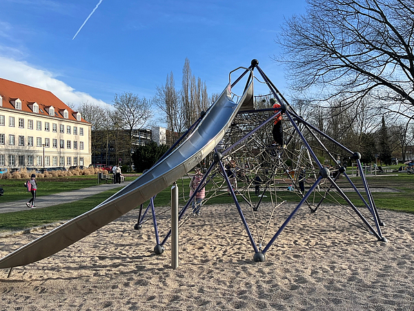 The playground in the park of Graupa Jagdschloss (a former hunting lodge) is inspired by the hunting route of Saxony’s aristocrats into the nearby forest. Here young adventurers can climb over bridges, arches and hurdles. The play elements are joined by seven bridge elements.