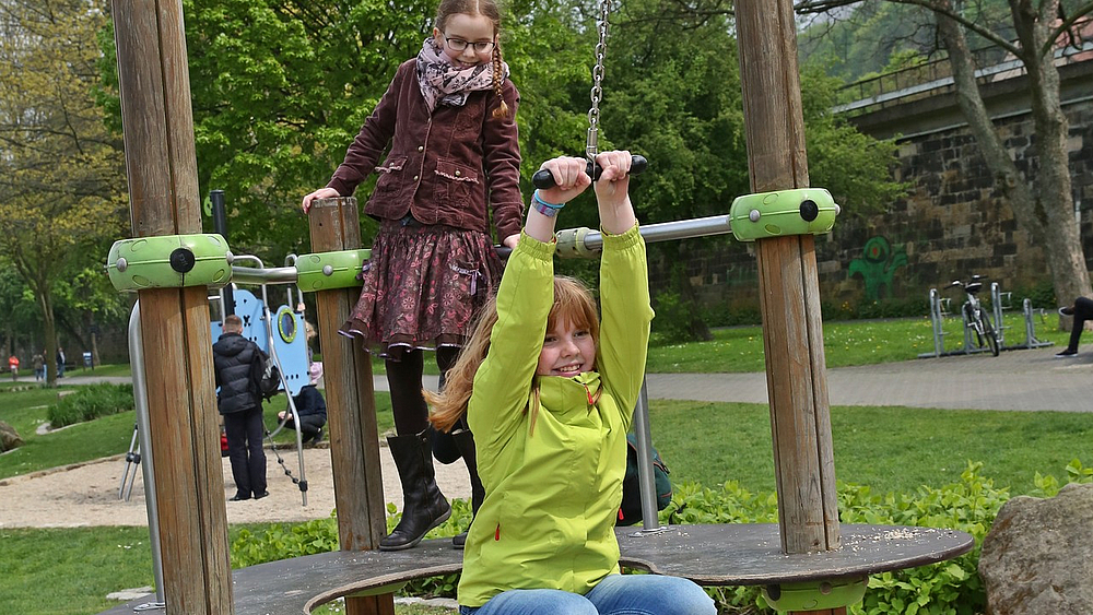 On the playground by Pirna’s Elbwiesen, only a stone’s throw from Pirna’s Old Town, everything revolves around water. Here young and old would-be sailors can set off on a big journey: the site has been designed like a watercourse with several “floating” small ships (play islands). Play equipment at both ends symbolise a ship’s bow and stern. Attractions include the play ship, a ship’s stern with viewing mast and a wavy slide.