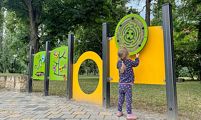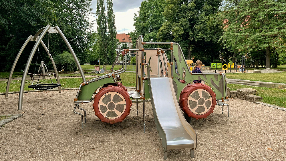 The greenery-filled Thälmannpark offers numerous play islands and a skatepark in the heart of Pirna. There is something for children of all ages. The youngest will love the play car with slide, nest see-saw, spring riders and sandpit area. Older children, meanwhile, will enjoy the seesaw, net pyramid with slide and Viking swing. A skatepark as well as goal nets with basketball ring complete the site.