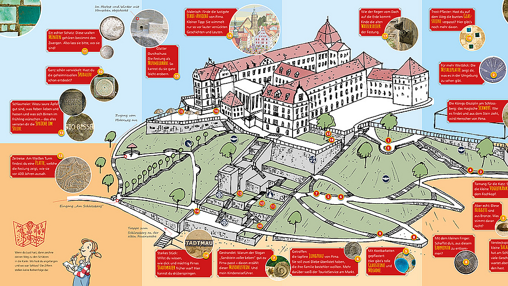 The flyer, which also acts as a treasure map and is available from Pirna’s Tourist Service, incorporates 18 small treasure points. It will guide you through the Terrassengärten (terrace gardens) and the renovated site on castle hill.