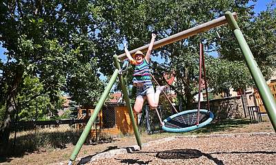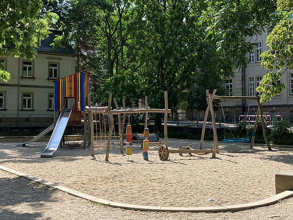 Der Spielplatz im Park des Jagdschlosses Graupa thematisiert den einstigen Jagdweg der sächsischen Kurfürsten im nahegelegenen Wald. Kleine Abenteurer können hier über Brücken, Bögen und Hindernisse klettern. Sieben Brückenelemente verbinden die Spielelemente miteinander.