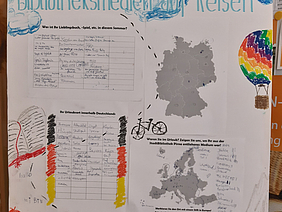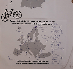 Den ganzen Sommer lang stand bei uns in der Bibo in der ersten Etage ein Flipchart zum Mitmachen. Das hat Sarah Schreiner, unsere FaMi-Auszubildende (jetzt 2. Ausbildungsjahr), gestaltet und damit jede Menge interessante Einträge bewirkt. Jetzt wissen wir und alle, wo die Bibliotheks-Medien überall im Sommer unterwegs waren. In Deutschland zum Beispiel im Altmühltal - Hamburg - Pirna, ja auch Hiergebliebene gibt's - Speyer und auch Zingst. In Frankreich lasen auch einige Bibliotheksnutzerinnen und -nutzer und auch in Italien, Österreich, Dänemark, auf Island und Gran Canaria. Einige Bücher gingen sogar auf Kreuzfahrt. Und doch kam kein Buch so wieder, dass wir gedacht hätten, es sei zum Schwimmkurs gewesen. Aber manche Titel von Lieblingsbüchern aus diesem Sommer klingen so: “Windstärke 17”, “Das Leben fing im Sommer an”, “Aller Tage Abend” oder “Ein grenzenloser Sommer”. Und wen wundert es, “Gregs Tagebücher” waren auch treue Begleiter. - Für manchen vielleicht auch in den Herbstferien? Auf jeden Fall sind unsere Buchsommer-geleerten Regale wieder gut gefüllt und freuen sich aufs Schmökern.