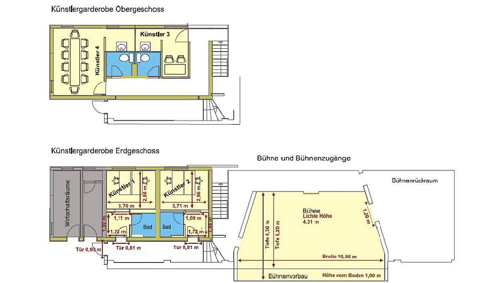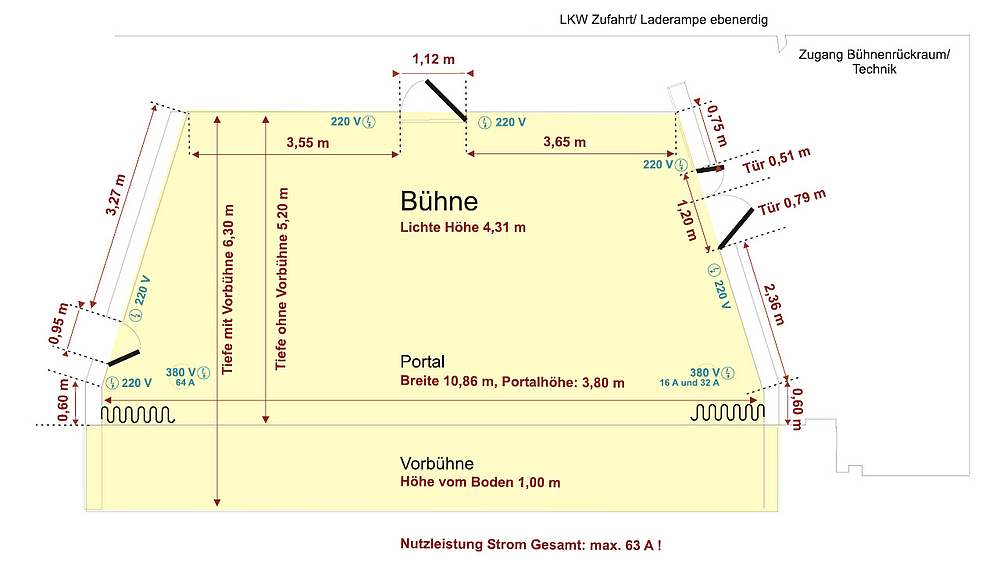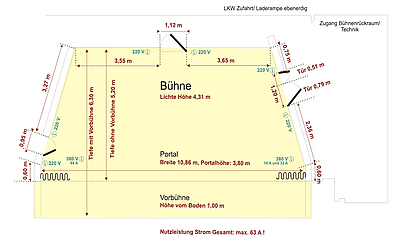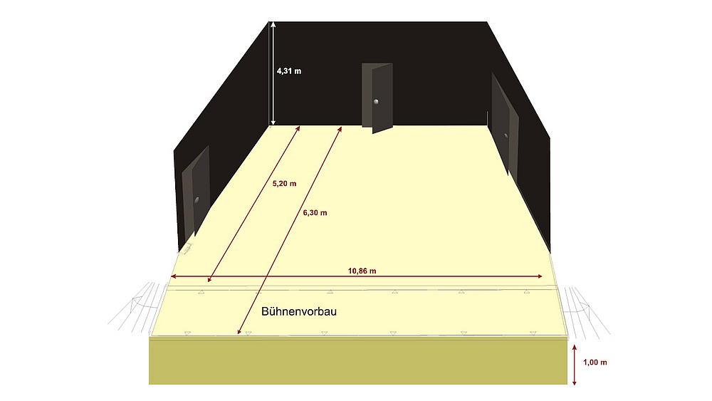 Die Höhe vom Bühnenboden zur Bühnendecke beträgt 4,31m.