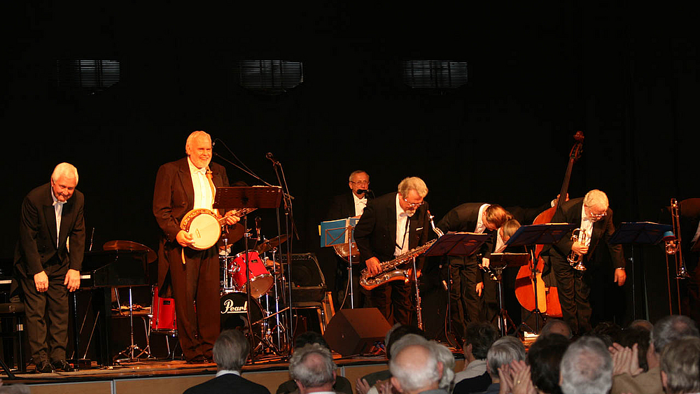 Ein schwarzer Backdrop verhängt alle drei Seiten der Bühne. Zusätzliche farbliche Dekorationsschals sowie Bühnenverkürzungen mit schwarzen Schals sind möglich.