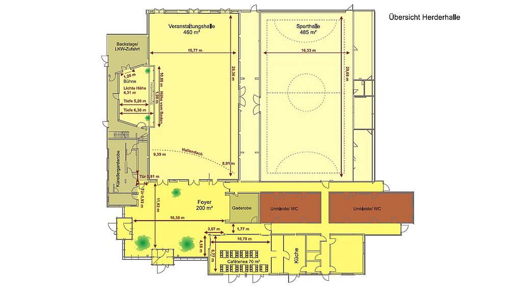 Der gesamte Gebäudekomplex der HerderHalle Pirna ist in folgende Räume unterteilt: